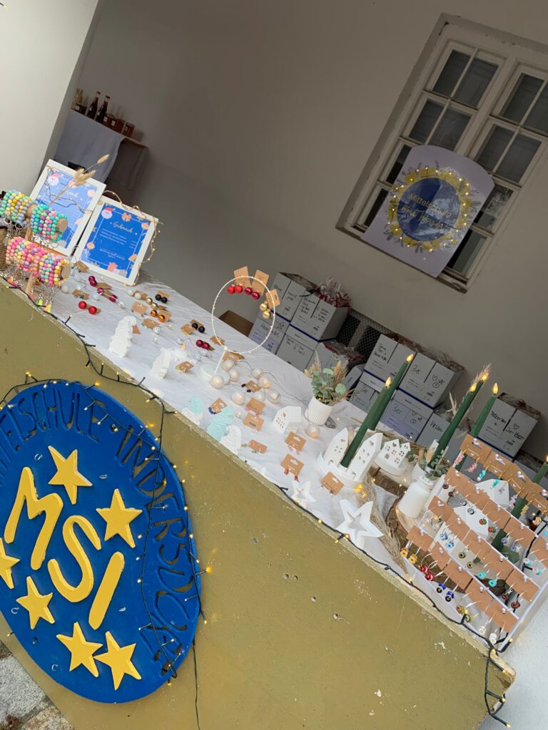 Bereits zum dritten Mal waren die Klassen 9a und 9b unserer Schule beim Weihnachtsmarkt „Advent am Kloster“ mit einem eigenen Verkaufsstand vertreten. Mit viel Engagement und Kreativität bereiteten die Schülerinnen und Schüler in den Wochen zuvor eine bunte Auswahl an Dekoartikeln aus Keramik, Ohrringen, Schlüsselanhängern sowie Süßigkeitentüten in Form von Elchen vor. Trotz winterlicher Temperaturen herrschte am Stand eine warme und fröhliche Atmosphäre. Viele Besucherinnen und Besucher blieben stehen, um die liebevoll gestalteten Handarbeiten und originellen Elch-Tüten zu bewundern – und natürlich auch, um das eine oder andere Geschenk oder eine kleine Nascherei für die Weihnachtszeit zu erwerben. Am Sonntag freuten sich die Schülerinnen und Schüler besonders über den Besuch von unserem Schulamtsdirektor Herrn Sikora, der sich persönlich ein Bild vom Engagement der beiden Klassen machte und großes Lob für die gelungenen Arbeiten aussprach. Der Erlös des Verkaufs kommt der Klassenkasse zugute und wird für gemeinsame Aktivitäten sowie für die Abschlussfahrt und Abschlussfeier verwendet. Ein herzliches Dankeschön geht an alle Beteiligten, die durch ihre tatkräftige Mithilfe, ihre Kreativität und ihren Einsatz den Stand auch heuer wieder zu einem besonderen Erfolg des Marktes gemacht haben!